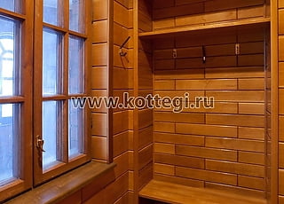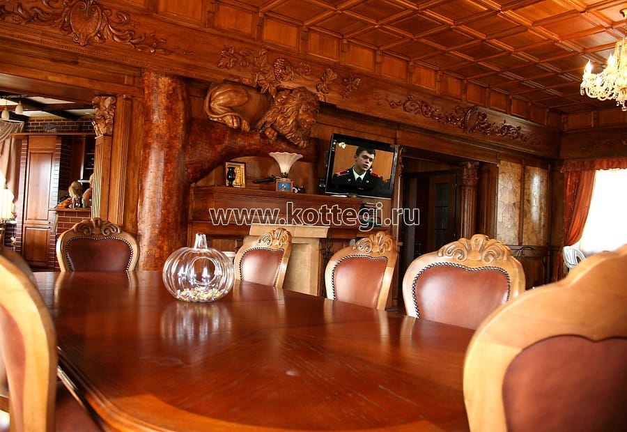 Отделка дома выполнена из ценных пород дерева, авторская резьба, скульптуры, теплый пол. Лестничные пролеты находятся в башне. Комфорт проживания обеспечивают все необходимые коммуникации: электричество 10 кВт, магистральный газ, скважина, центральная канализация, московский телефон.
