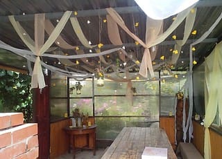 Парковка машин территории участка на 4 машины и более. В доме есть: камин, газовое отопление, центральные коммуникации, стол на 25 человек, спутниковое телевидение, бытовая техника, музыкальный центр, светомузыка. Летняя виноградная беседка, всепогодная беседка с камином, мангал (шампуры, решетка).